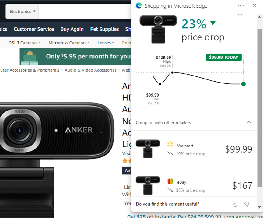 Another way that Edge helps you get the best deal when shopping online is through its pricing history and price comparison information. If you’re shopping on a website and the product that you’re viewing is cheaper on another site, Edge will let you know.